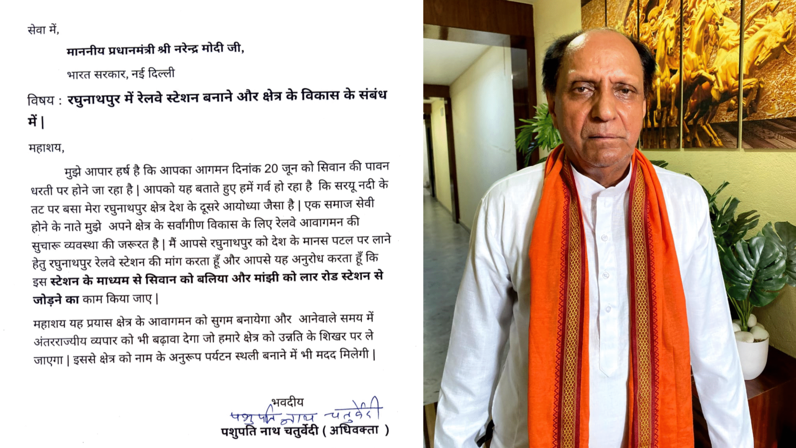 सिवान: रघुनाथपुर क्षेत्र के वरिष्ठ अधिवक्ता एवं समाजसेवी पशुपति नाथ चतुर्वेदी ने प्रधानमंत्री नरेंद्र मोदी को पत्र लिखकर रघुनाथपुर को रेलवे नेटवर्क से जोड़ने और वहां स्टेशन निर्माण की मांग की है। उन्होंने प्रेस कांफ्रेंस के माध्यम से कहा कि रघुनाथपुर क्षेत्र वर्षों से रेल संपर्क से वंचित है, जिससे विकास की गति बाधित हो रही है।