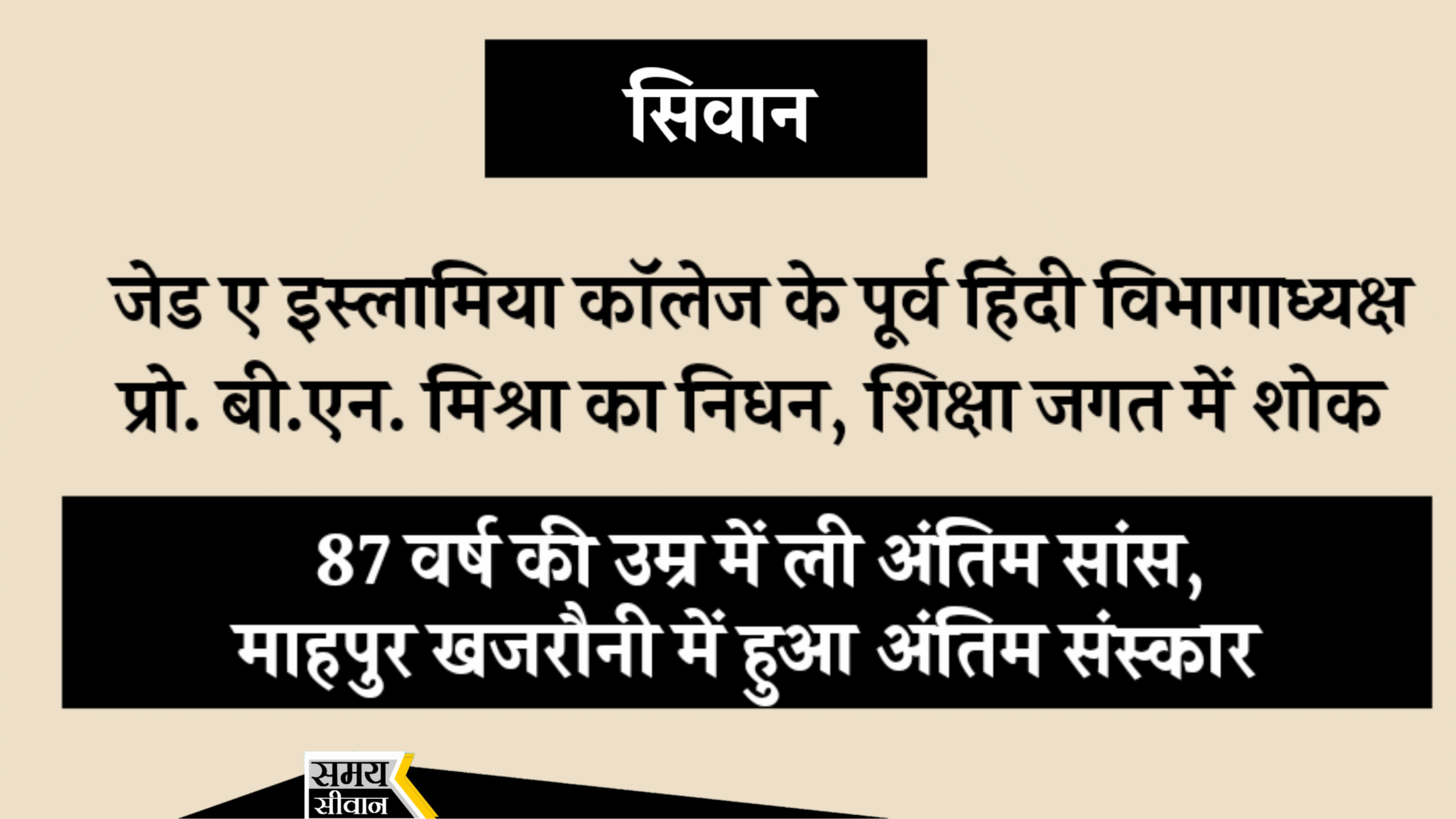 सिवान: जिले के प्रख्यात शिक्षाविद्, जेड ए इस्लामिया कॉलेज के हिंदी विभाग के पूर्व विभागाध्यक्ष और संस्थापक सदस्य प्रो. बी.एन. मिश्रा का सोमवार पूर्वाह्न 87 वर्ष की आयु में निधन हो गया। उनके निधन से न सिर्फ कॉलेज परिवार, बल्कि पूरे शैक्षणिक समुदाय में शोक की लहर दौड़ गई है।
