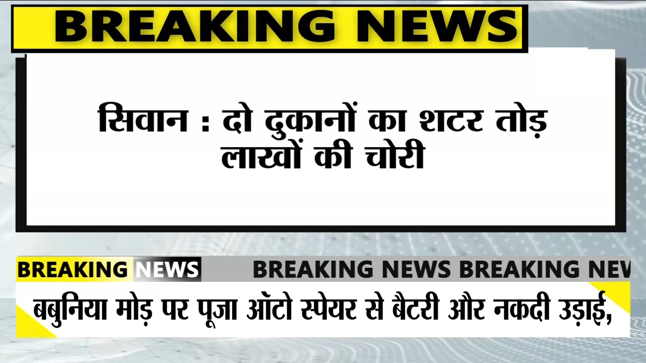 सिवान: नगर थाना क्षेत्र के बबुनिया मोड़ स्थित दो दुकानों को अज्ञात चोरों ने गुरुवार की देर रात निशाना बनाया। पूजा ऑटो स्पेयर और वेलकम मोबाइल नामक दुकानों का शटर तोड़कर चोरों ने लाखों रुपए मूल्य की बैटरी, नकदी और अन्य सामान की चोरी कर ली। घटना की जानकारी शुक्रवार सुबह दुकानदारों को हुई, जिसके बाद क्षेत्र में हड़कंप मच गया।