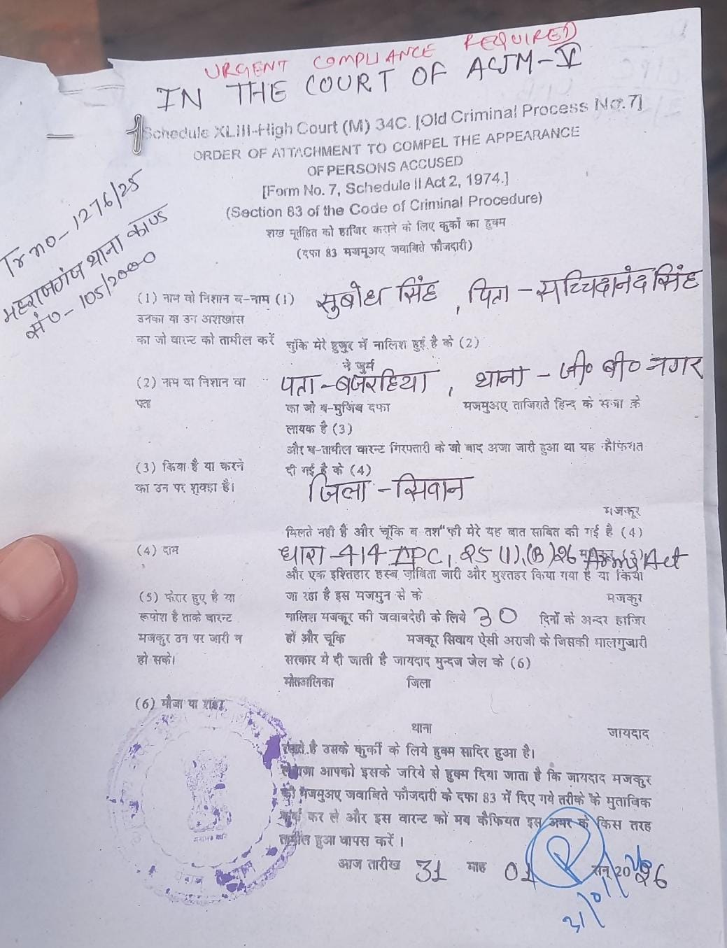 गिरफ्तार सुबोध कुमार सिंह पर जिले के कई अलग-अलग थानों में लगभग आधा दर्जन से अधिक अपराधिक मामले दर्ज हैं।यहां बताते चले की वर्षों पूर्व इसका सगा भाई प्रमोद कुमार सिंह जो जिले का मोस्ट वांटेड कुख्यात अपराधी रह चुका है।जो कई वर्ष पूर्व मारा गया था।मोस्ट वांटेड प्रमोद कुमार सिंह का महाराजगंज अनुमंडल में अपराधिक घटनाओं को लेकर ऐसा दबदबा था कि हमेशा व्यवसाई वर्ग खौफजदा रहते थे।हाल ही के दिनों में गिरफ्तार सुबोध कुमार सिंह एसीजीएम-5 के न्यायालय में फर्जीवाड़ा कर सुर्खियों में एक बार पुनः आ गया।इस फर्जीवाड़ा की प्राथमिकी न्यायालय के क्लर्क संजीव कुमार के लिखित तहरीर पर एक महीने पूर्व सिवान नगर थाने में दर्ज कराई गई थी।इस मामले में इसके एक रिश्तेदार गोपालगंज जिले के हरदियां थाना क्षेत्र के बैकुंठपुर निवासी भृगुनाथ सिंह को गिरफ्तार कर जेल भेजा गया है।मामला यह था कि इस कोर्ट में सुबोध सिंह को सरेंडर करना था लेकिन सुबोध सिंह ने अपने जगह पर अपने एक रिश्तेदार भृगुनाथ सिंह को उपस्थित कर दिया था।इस दौरान आधार कार्ड से मिलान करने पर वह पकड़ा गया।जांच में यह पाया गया था कि करीबी रिश्तेदारी के चलते भृगुनाथ सिंह ने सुबोध के बदले माननीय न्यायालय में नाम बदल कर सरेंडर किया है।