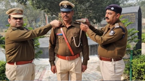 सिवान : पुलिस लाइन में आयोजित पिपिंग सेरेमनी कार्यक्रम के दौरान एसपी ने स्टार लगाकर दी बधाई